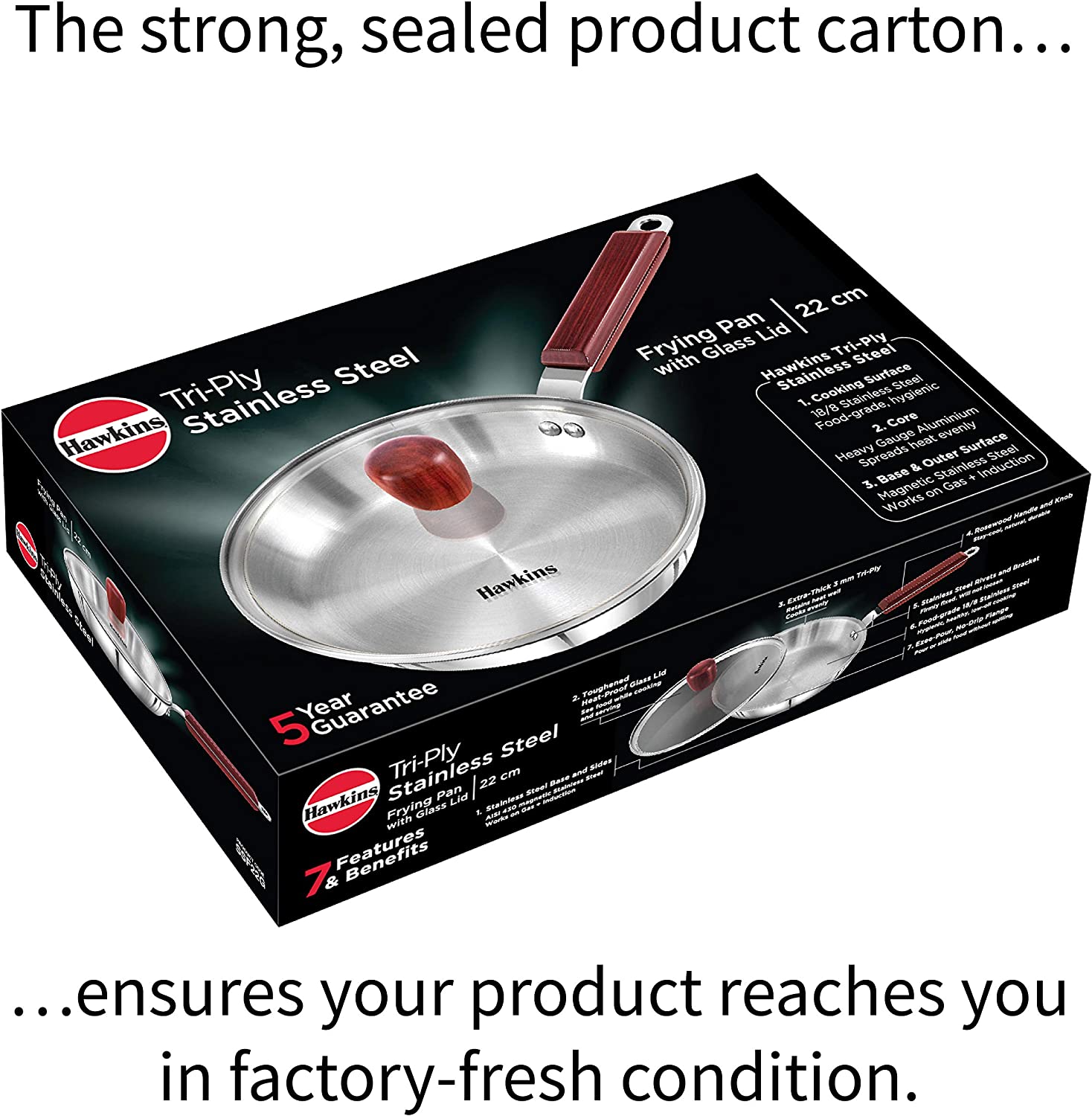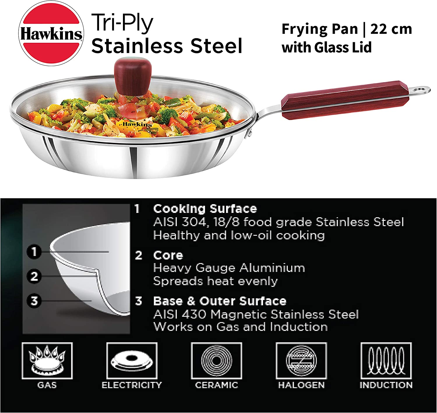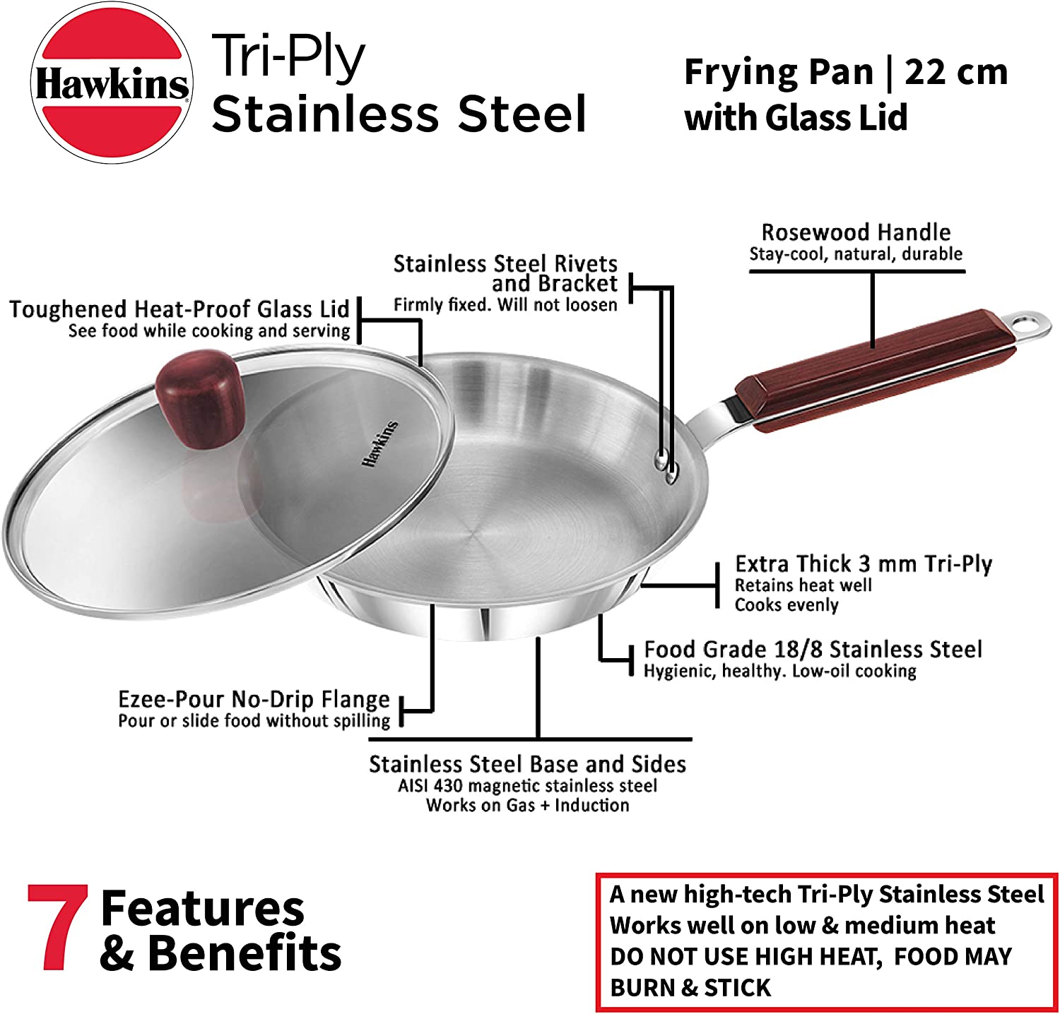 Hawkins - SSF22G Tri-ply Stainless Steel Frying Pan 22 cm with Glass Lid